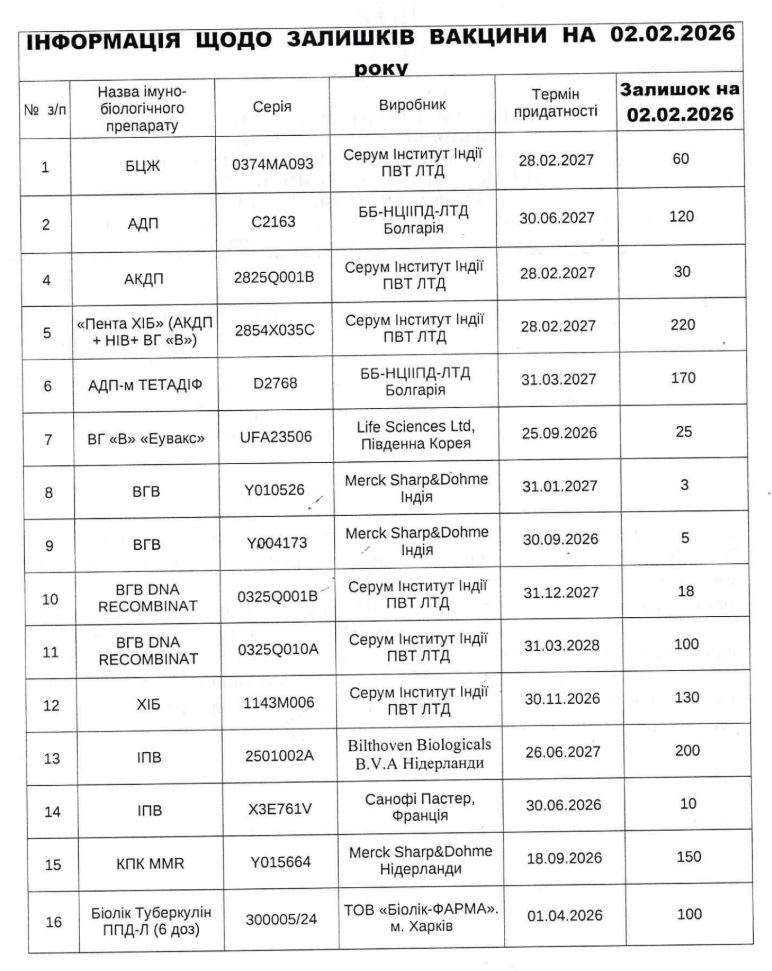 Інформація щодо залишків вакцини на 02.02.2026 року