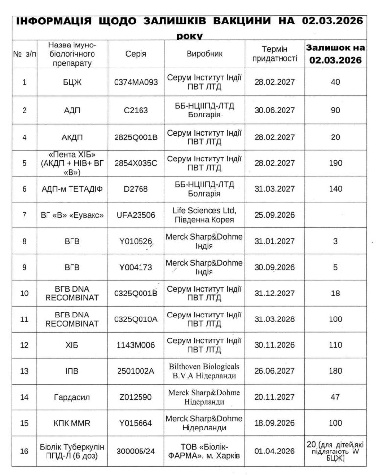 Інформація щодо залишків вакцини на 02.03.2026 року