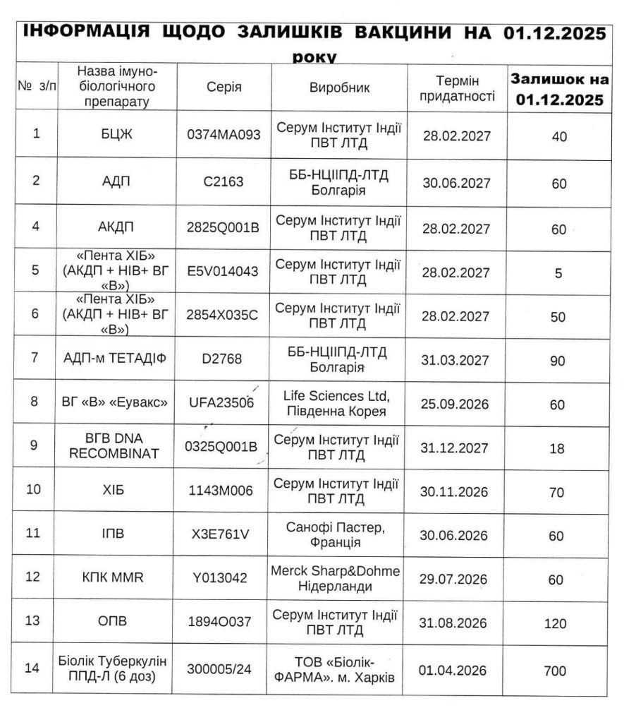 Інформація щодо залишків вакцини на 02.12.2025 року