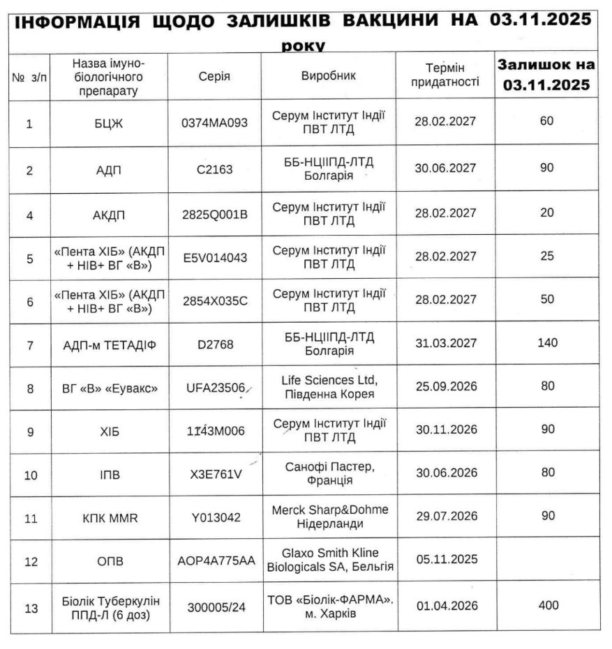 Інформація щодо залишків вакцини на 03.11.2025 року