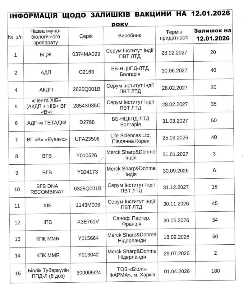 Інформація щодо залишків вакцини на 12.01.2026 року