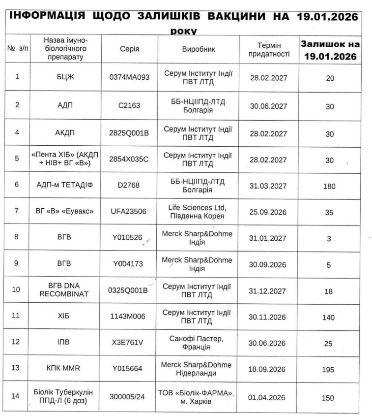 Інформація щодо залишків вакцини на 19.01.2026 року