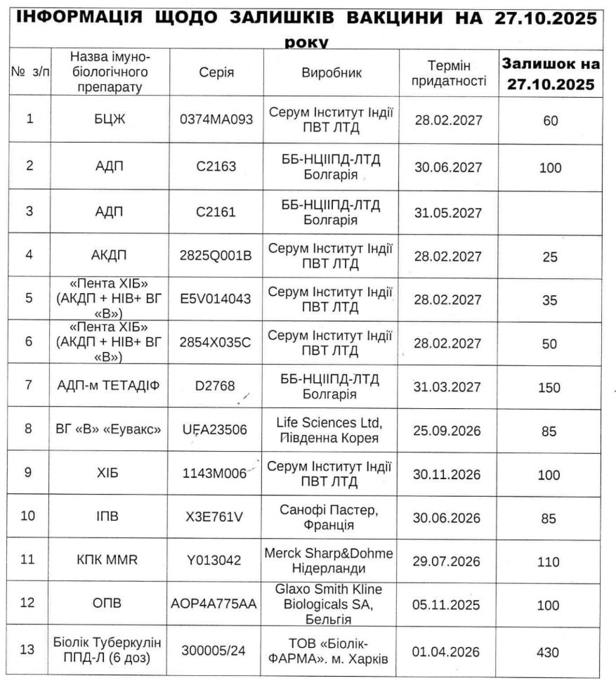 Інформація щодо залишків вакцини на 28.10.2025 року