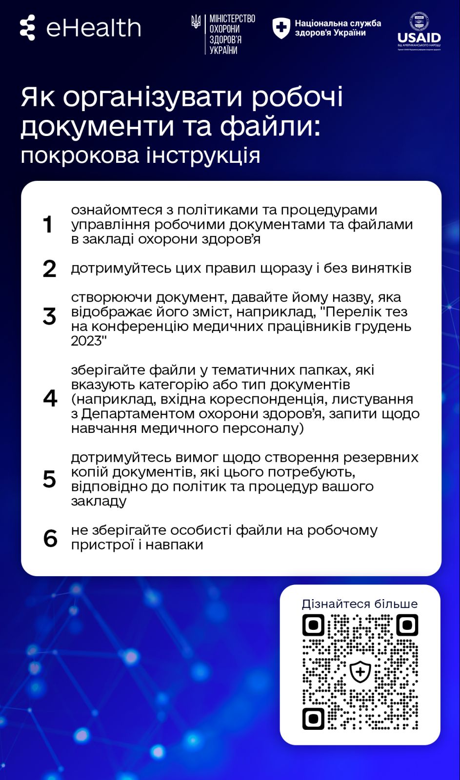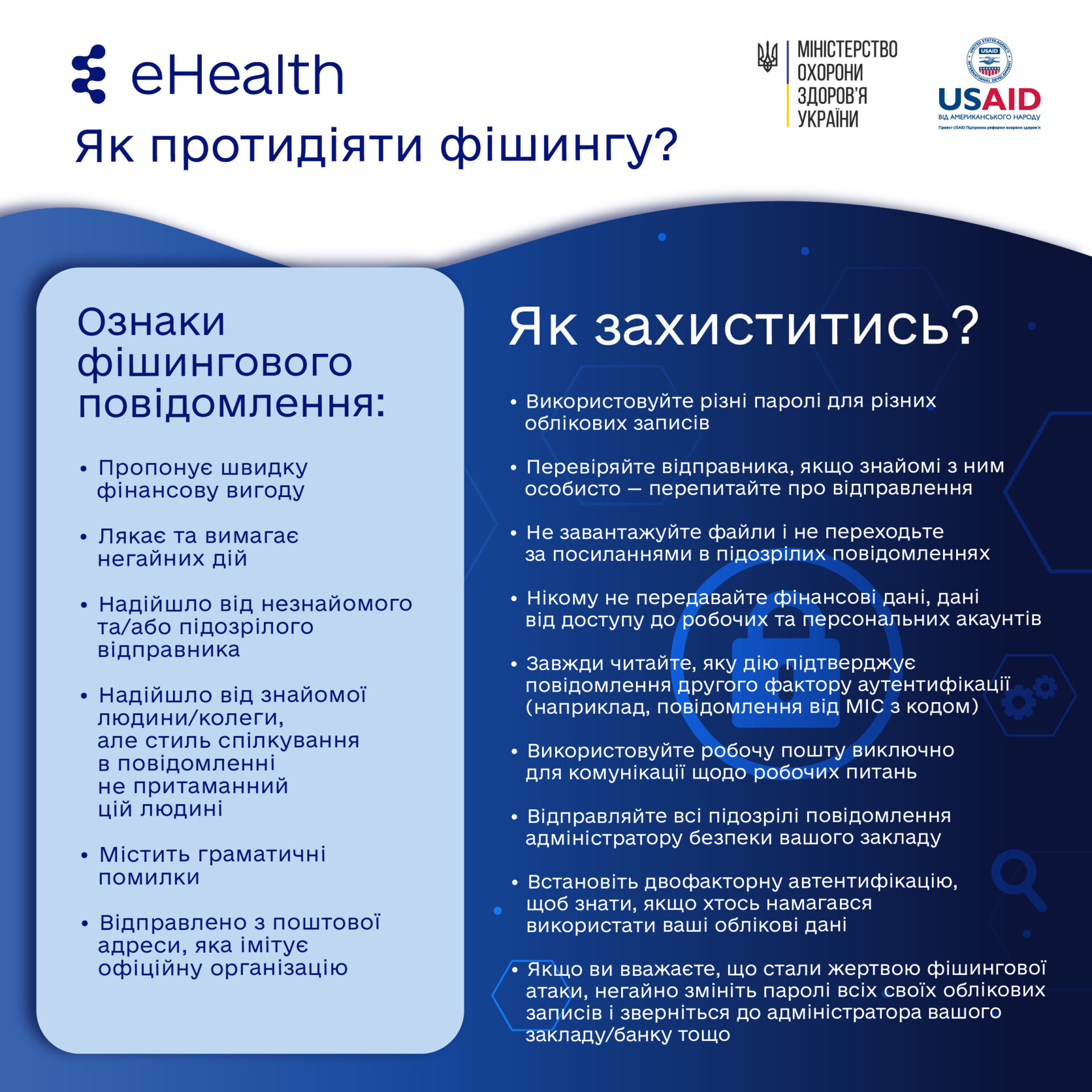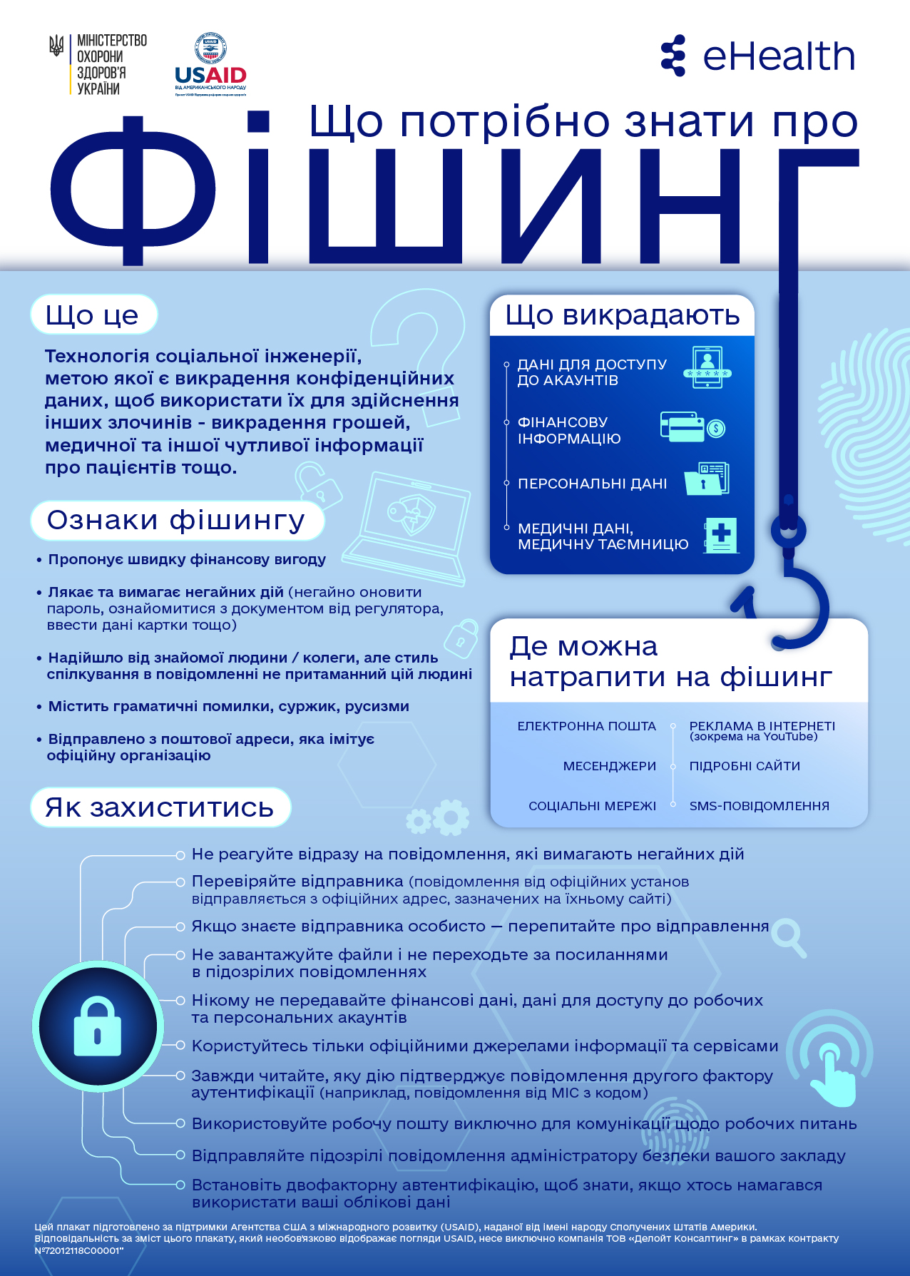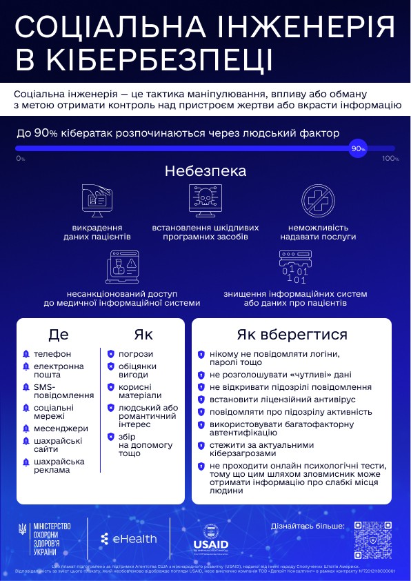 Міністерство охорони здоров’я за підтримки проєкту USAID «Підтримка реформи охорони здоров’я» сформувало бібліотеку матеріалів, що допоможуть лікарям, медичним сестрам і братам, управлінцям, адміністраторам медичних закладів та всім зацікавленим партнерам отримати основні знання про види і форми кіберзагроз та чіткі рекомендації щодо боротьби з ними.
