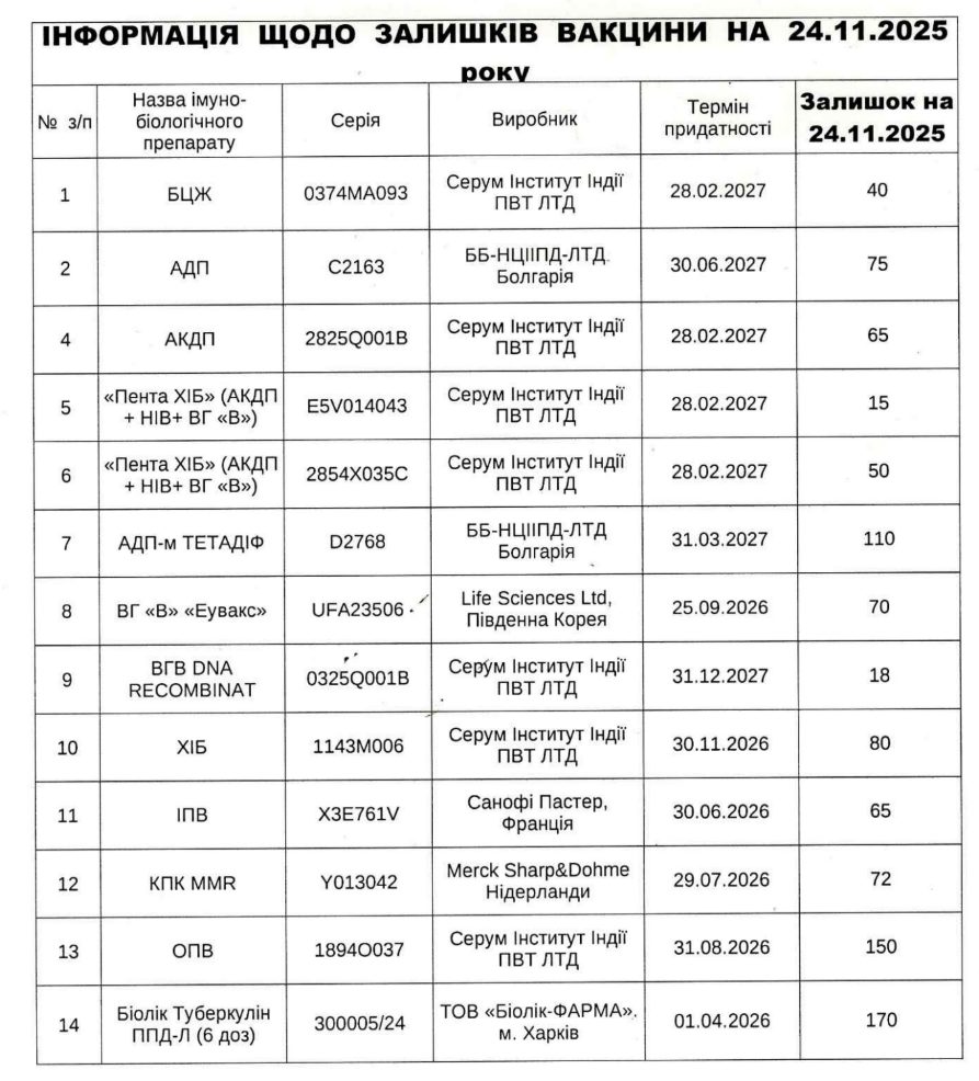 Залишки та благодійний фонд ІНФОРМАЦІЯ ЩОДО ЗАЛИШКІВ ВАКЦИНИ НА 24.11.2025 року Залишки ТМЦ станом на 31.08.2025: Основний склад Вторинна медична допомога Основний склад Первинна медична допомога Вакцини